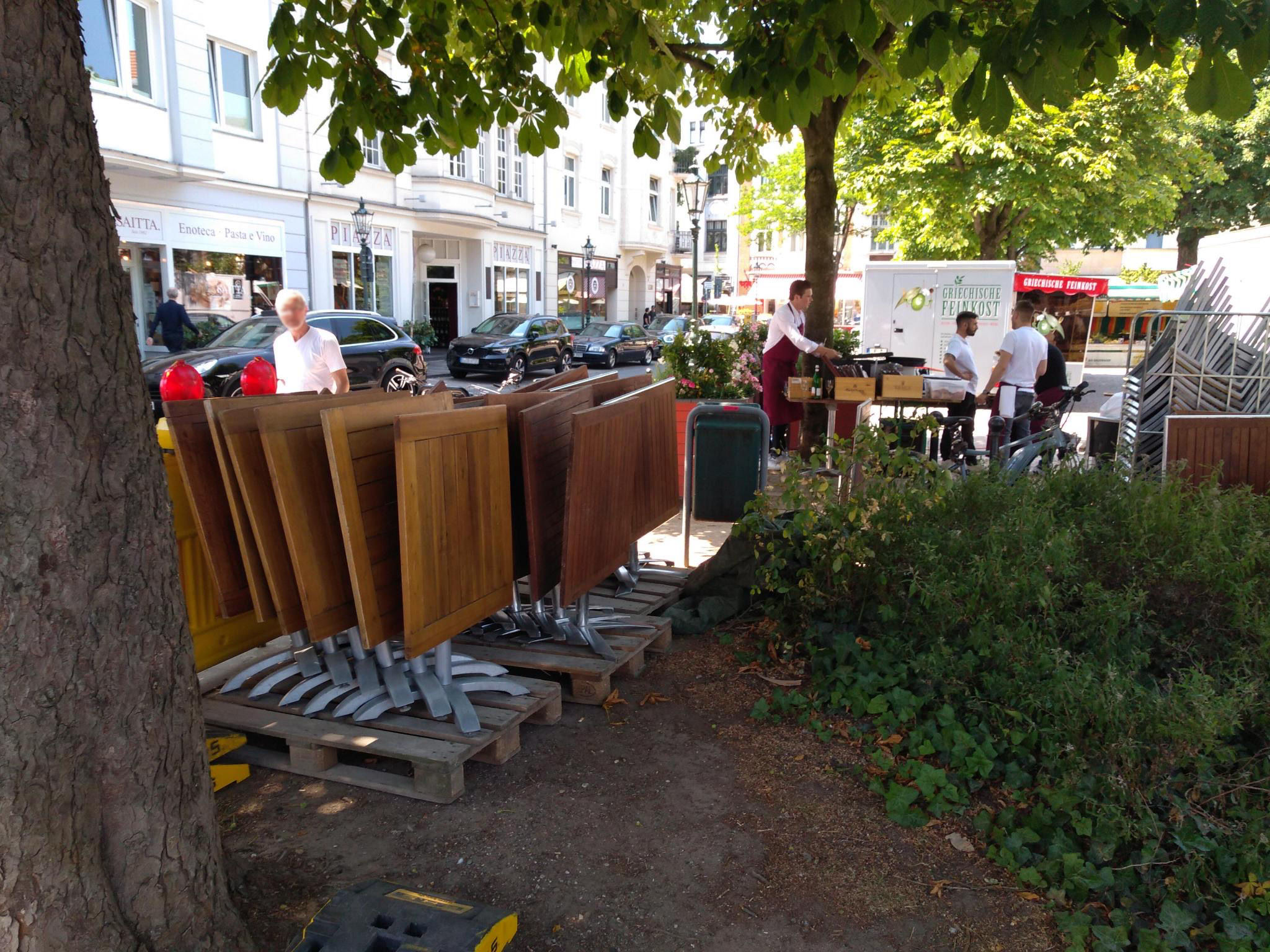 Dann zog die Gastronomie auf die Platzseite. Von Anfänglich kleinen Bereichen mit Tischen wuchs der Platzsbedarf auf nunmehr die komplette gepflasterte Fläche. So war die Nutzung nicht gedacht.