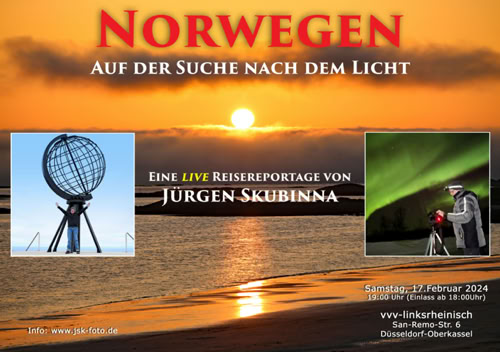 Im Rahmen seiner live Reisereportagen Tour 2023/24 präsentiert Jürgen Skubinna am 17. Februar 2024 seine aktuelle Foto Show, „Norwegen - Auf der Suche nach dem Licht“, in den Räumen des vvv-linksrheinisch in Düsseldorf-Oberkassel.