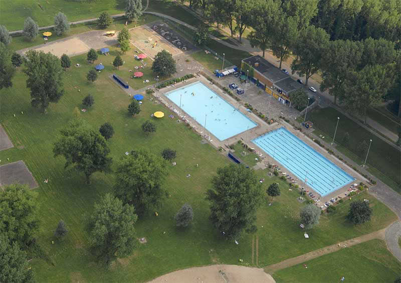 Zwischen dem Rhein und dem Löricker Deich liegt weit auseinander gezogen die Anlage des Löricker Freibades. Die Gebäude entlang des alten Rheinarms lassen vage vermuten,was die ursprüngliche Idee dieser Anlage war.